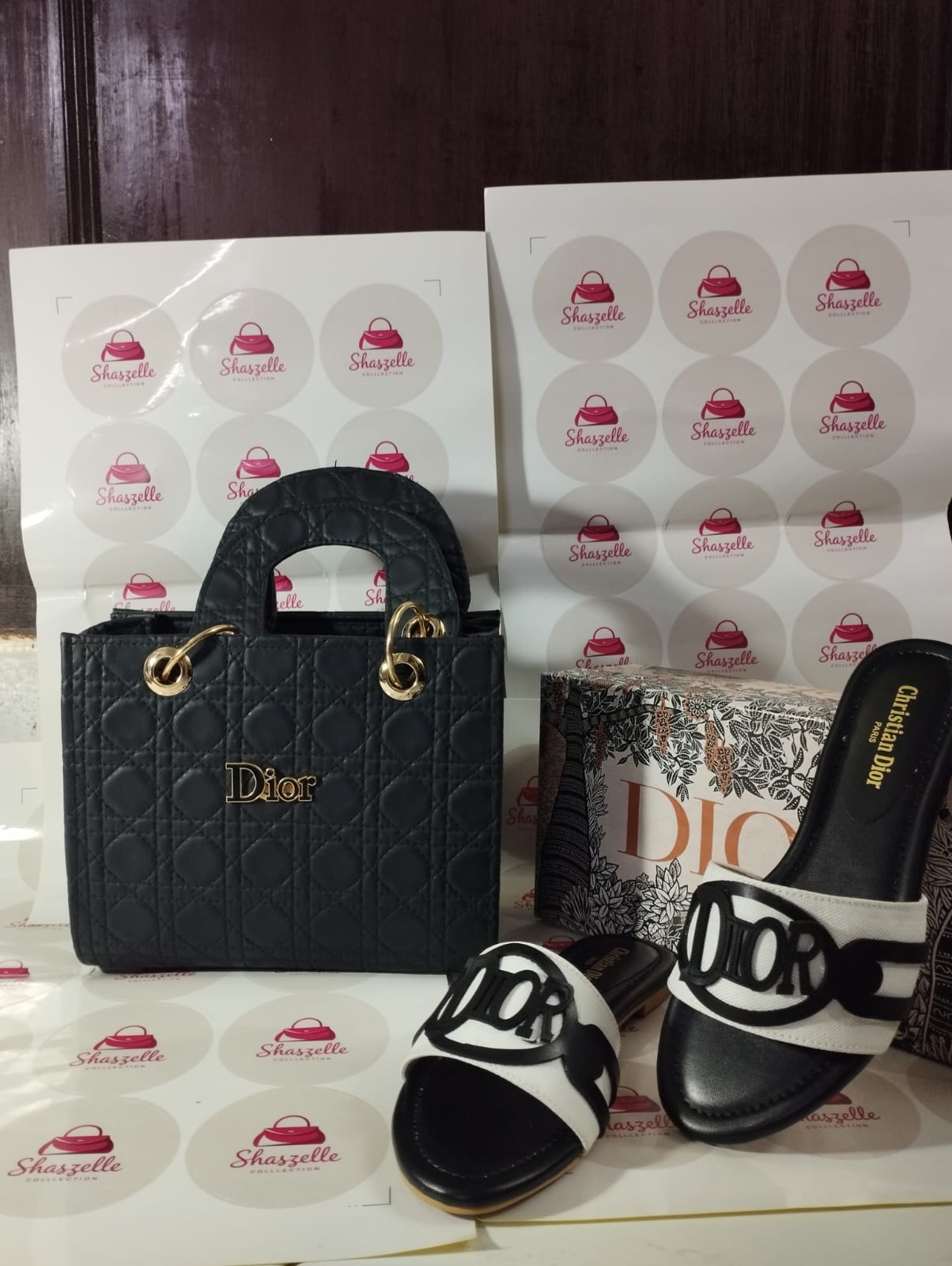 Turn heads with this Dior-inspired luxury combo. Featuring the iconic quilted monogram design, this set includes a sleek black shoulder bag with gold chain detail and matching slides — perfect for effortless style and comfort.